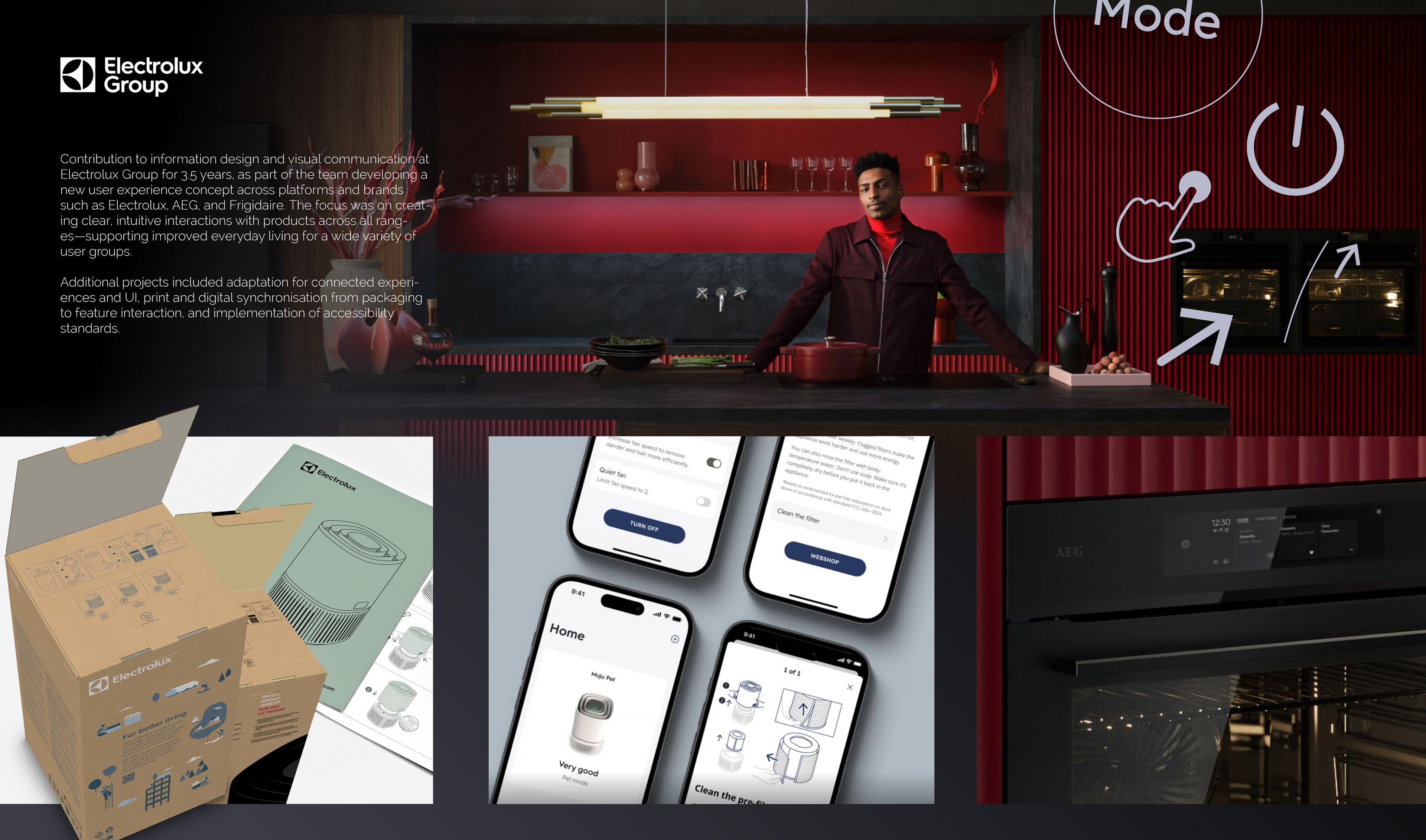Contribution to information design and visual communication at Electrolux Group for 3.5 years, as part of the team developing a new user experience concept across platforms and brands such as Electrolux, AEG, and Frigidaire. The focus was on creating clear, intuitive interactions with products across all ranges—supporting improved everyday living for a wide variety of user groups.