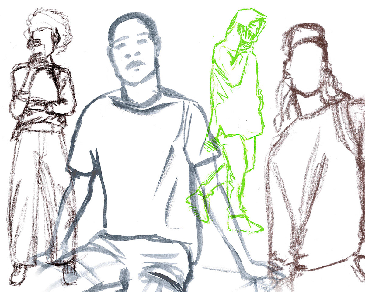 Collage of street-style sketches from a fashion illustration course 👟 Finally scanned and cleaned up some of the sketches! Assignment called for 100 sketches using various combinations of i.e. continuous line, time limits and mixed media.